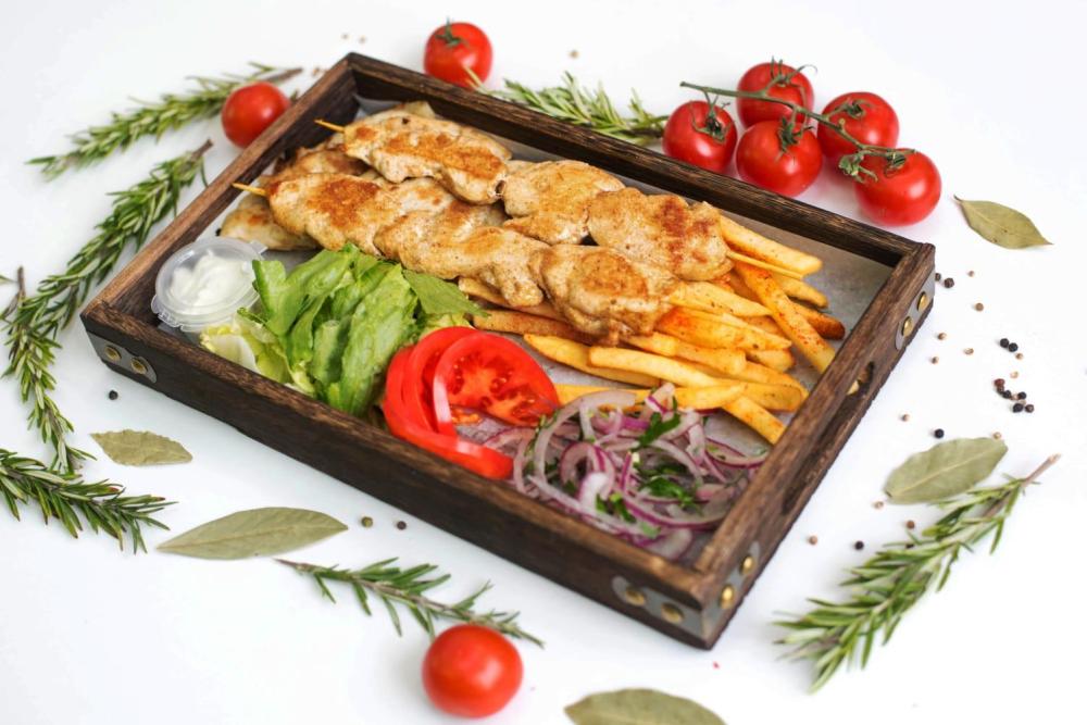 Лаваш, курица, лук, помидор, салат, соус лимонный. соус дзадзыки, картофель фри